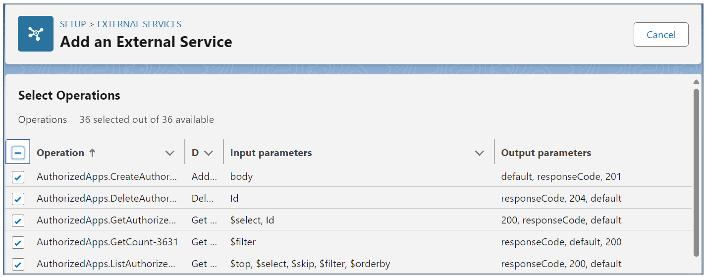 The input parameters are appended to the URL, such as $top, $filter, and $orderby. See API Operations for a complete parameter reference. The input parameters are based on OData filtering. Select the operations you want to include in the external service.