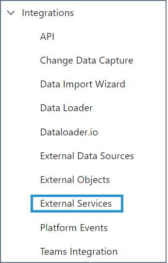 Log in to Salesforce. In Salesforce Setup, select Platform Tools > Integrations > External Services.