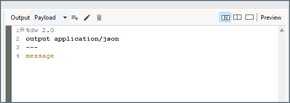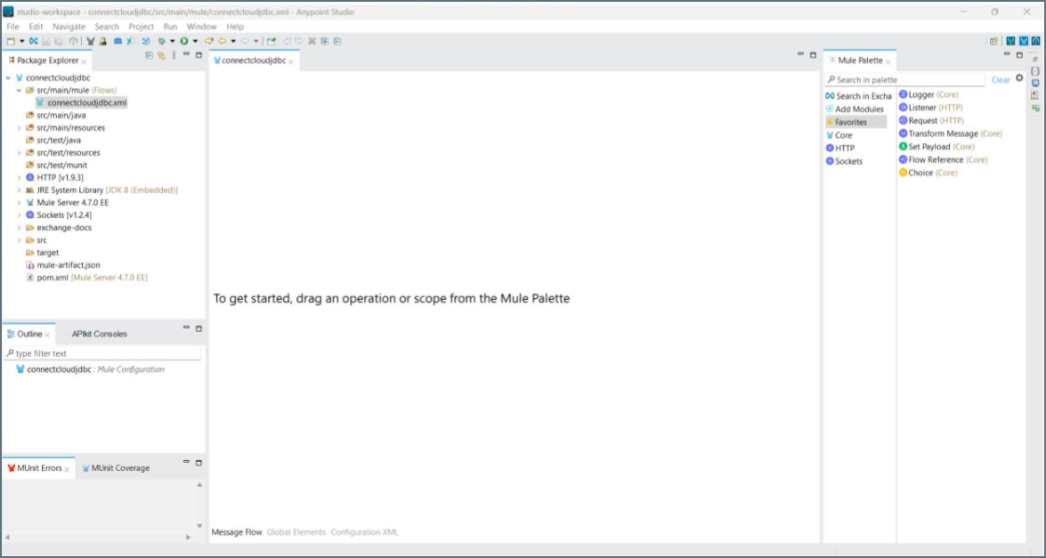 In the Mule Palette, drag Transform Message to the Message Flow area.