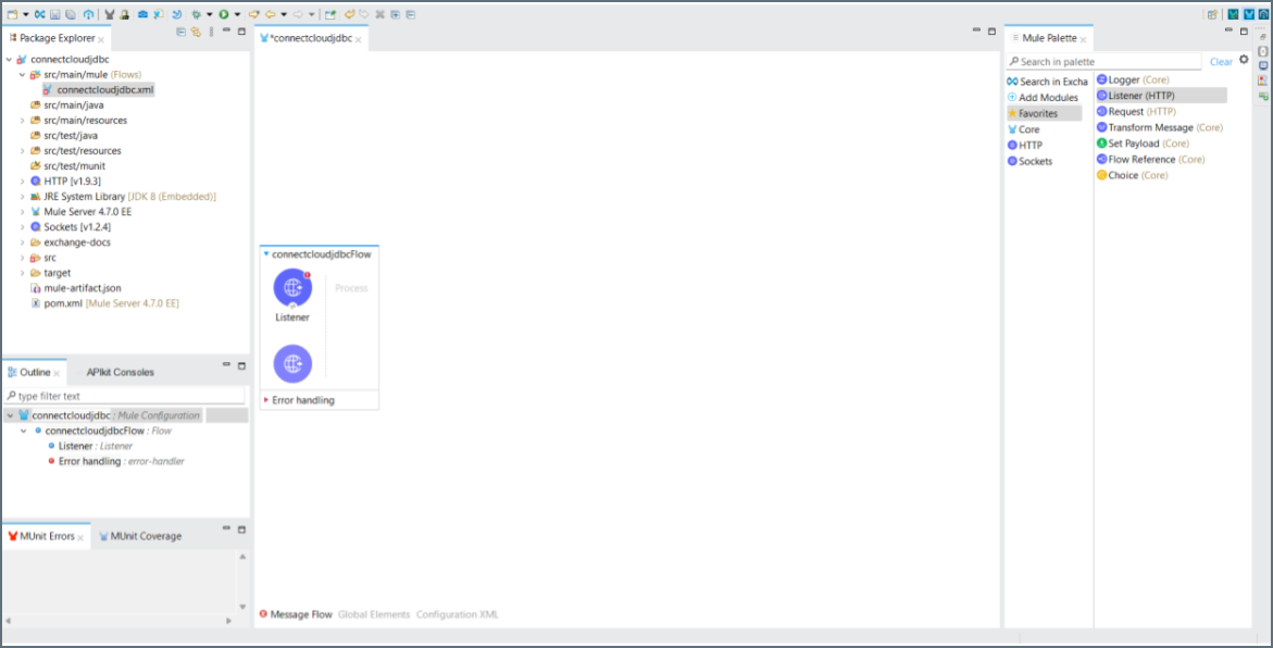 In the Mule Palette on the right, drag a HTTP Listener to the Message Flow area.