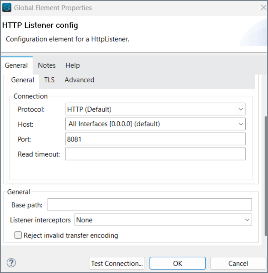 Click the + sign to the right of Connector configuration. The HTTP Listener config dialog appears.