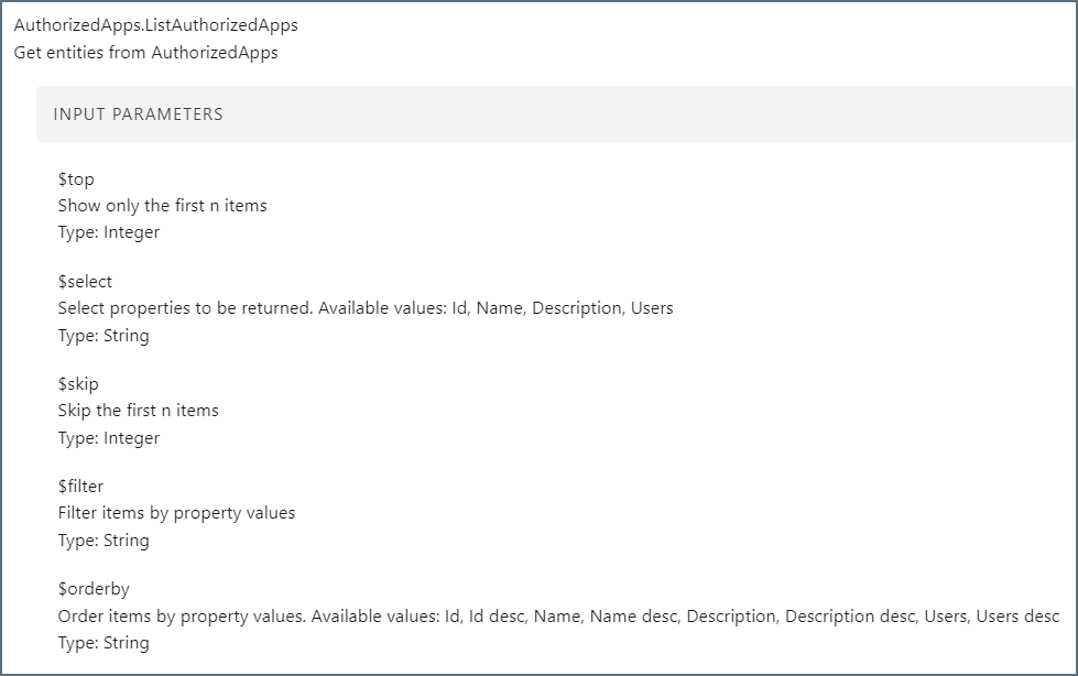 The input parameters are appended to the URL, such as $top, $filter, and $orderby. See API Operations for a complete parameter reference. The input parameters are based on OData filtering. Select the operations you want to include in the external service.